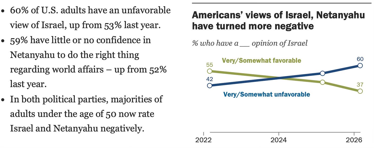 Since then, Americans have become far less friendly to Israel. This is demonstrated by polls 1 and the election of fierce Israel hater Zohran Mamdani as mayor of NYC. 2