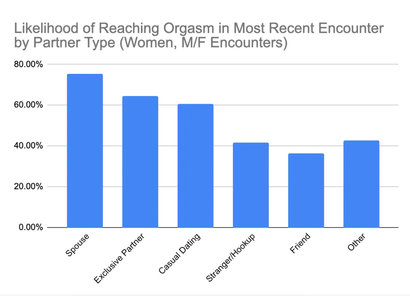 She defines “best sex” as orgasm, yes or no, a simple yet dispositive and rigorous measure. Here is her orgasm frequency chart for women in different heterosexual relationships.