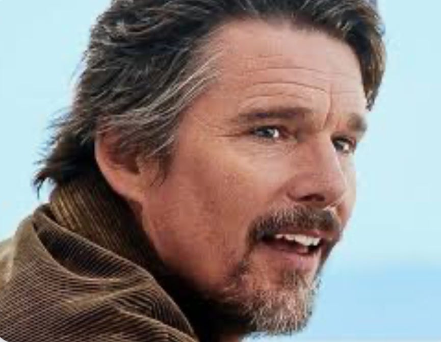 We had watched a rom-com the night before, “Juliet, Naked” with a great cast of Rose Byrne, Chris O’Dowd, and of course Ethan Hawke. Below, as he appeared in the movie.